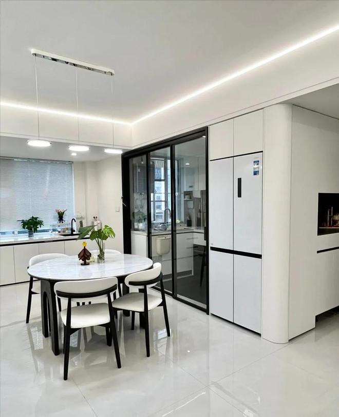 如果不想天天擦冰箱的话,在装修时就可以敲掉厨房门边上的非承重墙,再做上嵌入柜子,与玄关鞋柜形成一个弧形转角设计,再把冰箱嵌入其中,这样无论是日常取用食材,还是保持厨房内的有序与功能性的完整 ,全都兼顾上了。